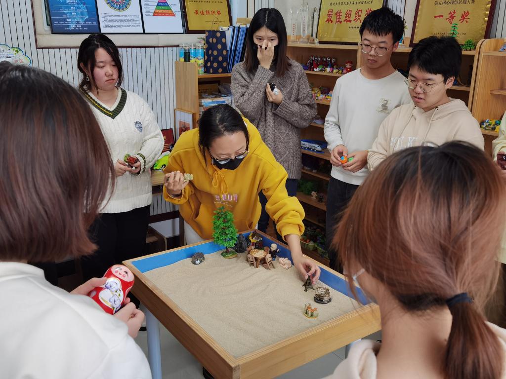 于艺术楼1323室举行“心灵之旅”沙盘团体心理辅导活动。活动邀请艺术果冻传媒