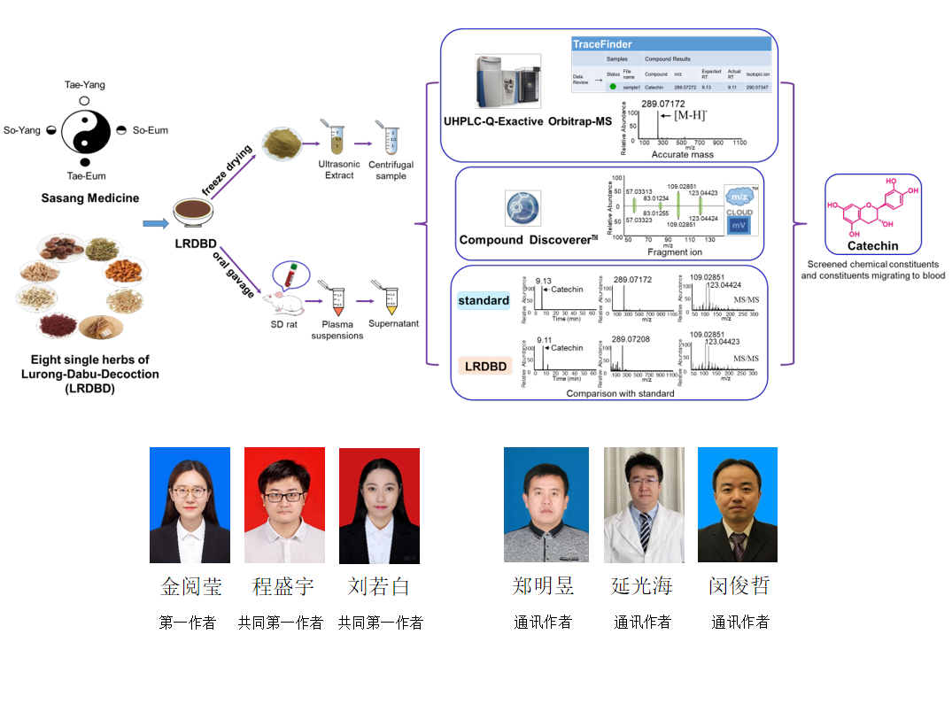 朝医是中国传统医学的重要组成部分。《东医寿世保元》是朝鲜族传统医学的经典著作。鹿茸大补汤源自《东医寿世保元》,具有健肺止咳、益精血的作用。作为典型的朝药方剂,鹿茸大补汤已在临床上用于治疗哮喘几十年。虽然许多民族药(朝药)处方已被报道具有良好的临床效果,但其化学成分及作用机制尚不清楚。基于上述原因,闵俊哲教授团队与郑明昱、延光海教授合作针对鹿茸大补汤的物质基础和体内入血原型成分及代谢物进行了全面研究。