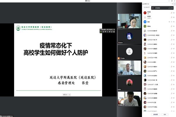 附属医院(延边医院)感染管理处副处长张莹做了题为《疫情常态化高校学生如何做好个人防护》的讲座。张莹副处长长期工作在抗疫和防疫一线,从事抗疫防疫培训、督查、指导和一线具体工作,有深厚的理论基础和丰富的实践经验。